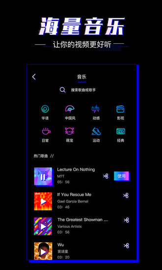 4.音乐库:内置数万首正版热门音乐,涵盖流行、电子、摇滚等多种风格,支持智能匹配背景音乐。