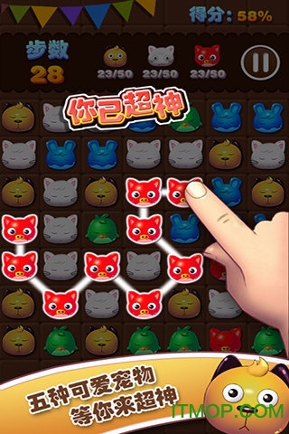 1.核心玩法是通过消除三个或以上相同颜色的宠物方块来完成关卡任务,每个关卡都有独特的目标要求。