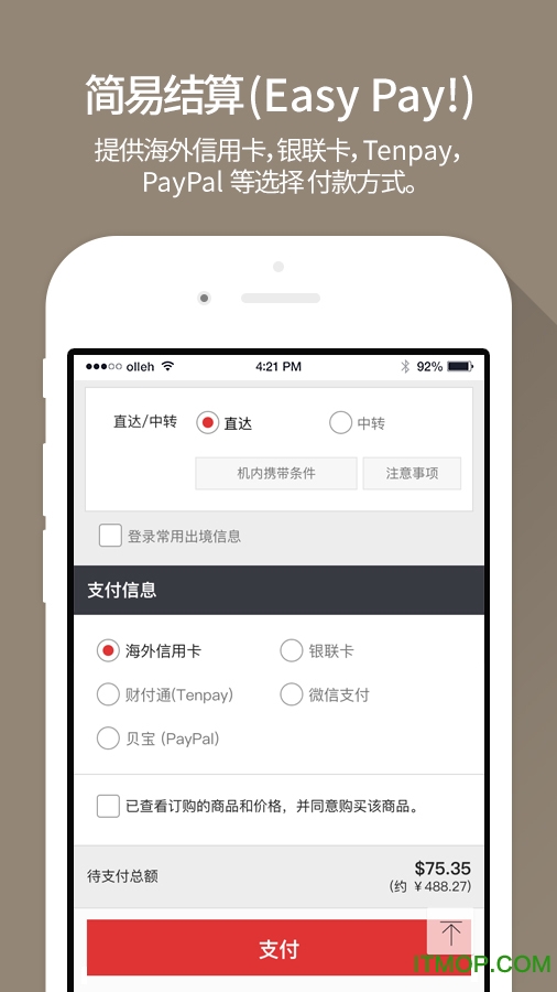 3.简易结算:提供海外信用卡,银联卡,Tenpay,PayPal等选择?付款方式。支持17种国际支付方式,结算时自动计算最优关税方案,最大限度降低用户购物成本。
