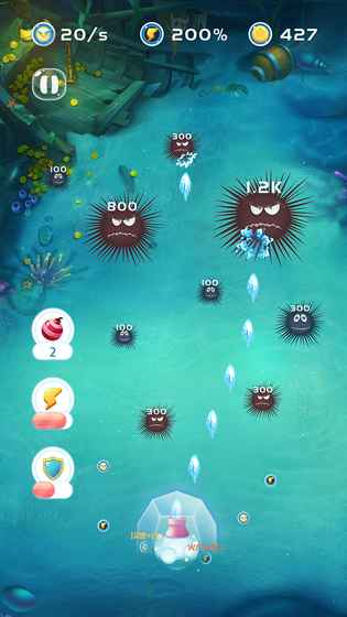 2、美丽的海底世界暗藏危机,各种形态各异的海胆会从不同角度向你袭来。玩家需要时刻保持警惕,运用策略选择最佳射击时机和角度。随着游戏深入,还会出现特殊海胆,如加速海胆、分裂海胆等,为游戏增添更多变数和挑战;