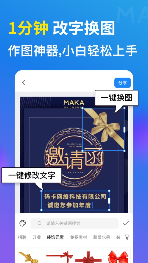 1.MAKA的智能编辑器采用模块化设计理念,用户只需简单拖拽即可完成专业级作品创作,特别适合没有设计基础的用户快速上手。