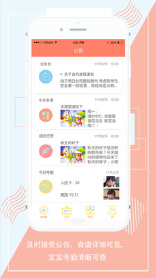 1.首页功能全面升级,老师可发布各类通知、菜谱、作业等,同时也能查看自己收到的通知,支持消息分类管理;