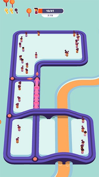 采用优化过的触控操作方案,只需在转向点轻扫屏幕即可完成精准变轨。系统会智能预测轨道走向,并提前显示转向提示箭头。针对长火车设计了"蛇形跟随"物理系统,车头转向后车身会自然形成流畅的弧线,大大降低了操作难度,让各年龄层玩家都能快速上手。