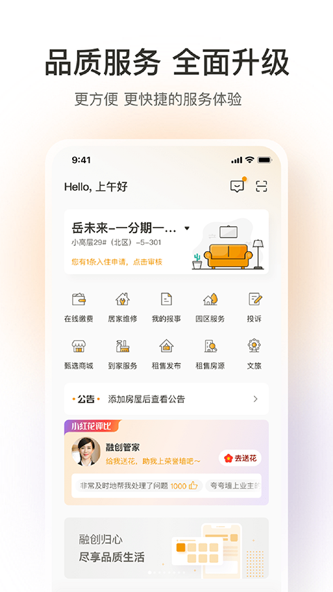 每一朵小红花都是对管家的肯定和鼓励,你和管家的每一次连接都有美好充斥其中,快来分享管家与你的暖心时刻。独创的服务评价体系,用户可通过赠送虚拟小红花表达谢意,累计花朵将转化为管家的绩效奖励。每月评选"暖心管家",展示温馨服务故事,营造有温度的社区文化。参与互动还可获得实物奖励,让感恩之心温暖整个社区。
