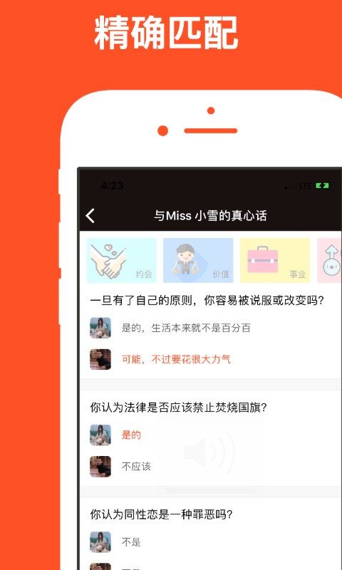 4、百分百真实的真心话,轻松找到与你三观合适匹配的人。所有新用户必须完成10道必答的真心话测试,确保个人信息的真实性,避免遇到虚假账号。
