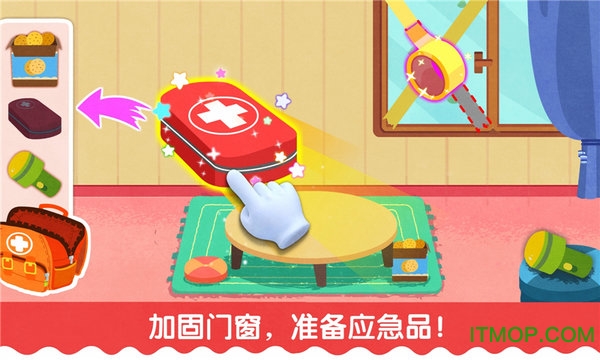 在家庭场景中,小朋友需要帮助家人做好防台风准备:首先将阳台上的衣服、花盆等物品收进室内,避免高空坠物危险;然后检查门窗是否关紧,并在玻璃上贴"米"字形胶带,增强抗风能力。游戏还设置了应急包准备环节,孩子们需要根据提示收集毛毯、干粮、手电筒等应急物资,学习应对停水停电的常识。每个互动环节都配有生动的动画演示和语音指导,让孩子们在游戏中掌握实用的生活技能。