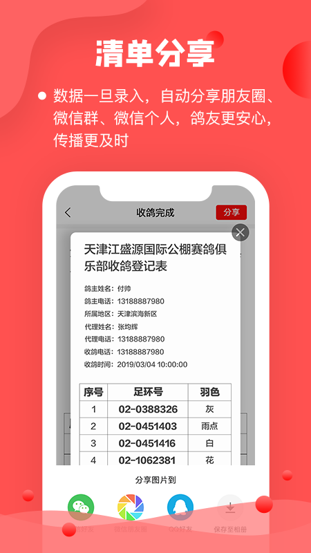 3、清单分享:数据录入后自动生成分享链接,支持一键分享至朋友圈、微信群或微信好友,实现信息快速传播。鸽友可随时查看最新动态,增强互动体验,提升公棚透明度。