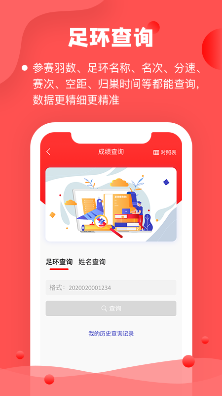 4、足环查询:提供全面的赛事数据查询功能,包括参赛羽数、足环名称、名次、分速等详细信息。系统采用精准算法处理数据,确保查询结果的准确性和时效性,为鸽友提供专业的数据支持。