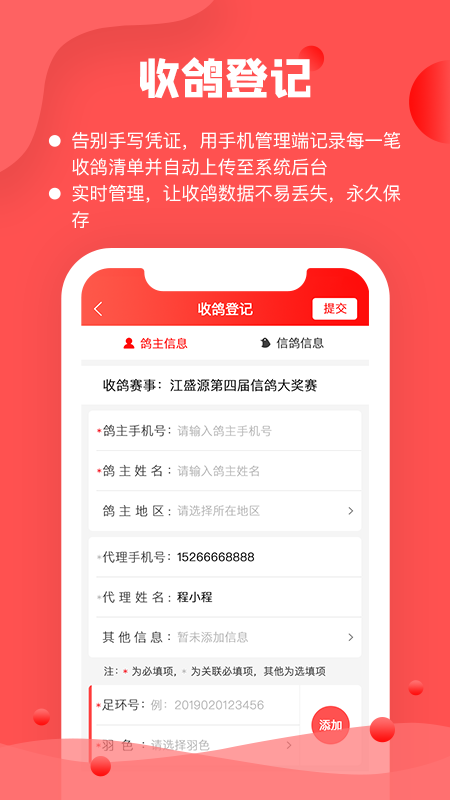 2、收鸽登记:彻底告别传统手写凭证方式,通过手机端即可完成收鸽信息录入,数据自动上传至系统后台并永久保存。系统支持多种查询条件,方便随时调取历史记录,有效防止数据丢失。