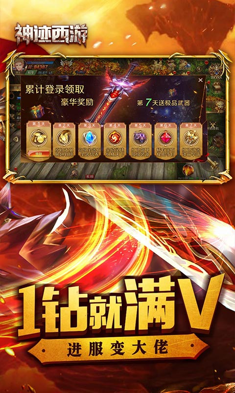 4、连续七日登录可领取极品武器、原初光翼、坐骑领主和顶级装备套装,战力飙升不是梦;