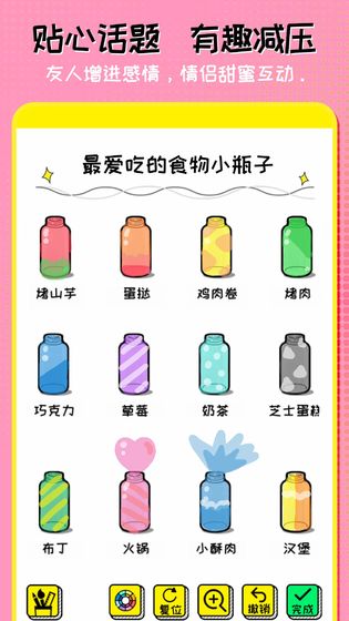 《我的心动恋爱小瓶子》安卓版是一款兼具治愈与趣味性的休闲小游戏。游戏以各种造型可爱的瓶子为载体,通过简单的涂鸦操作就能完成心理测试和情绪表达。每个瓶子的颜色深浅都代表着不同的情感程度,让玩家在轻松愉快的游戏过程中更好地了解自己的内心世界。独特的测试玩法搭配治愈系的画面风格,带来别具一格的游戏体验。只需动动手指,就能享受这份简单纯粹的快乐,快来试试这款能温暖心灵的小游戏吧!