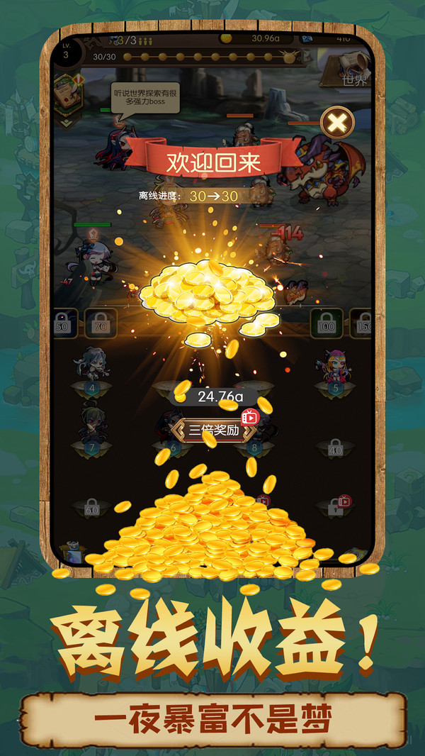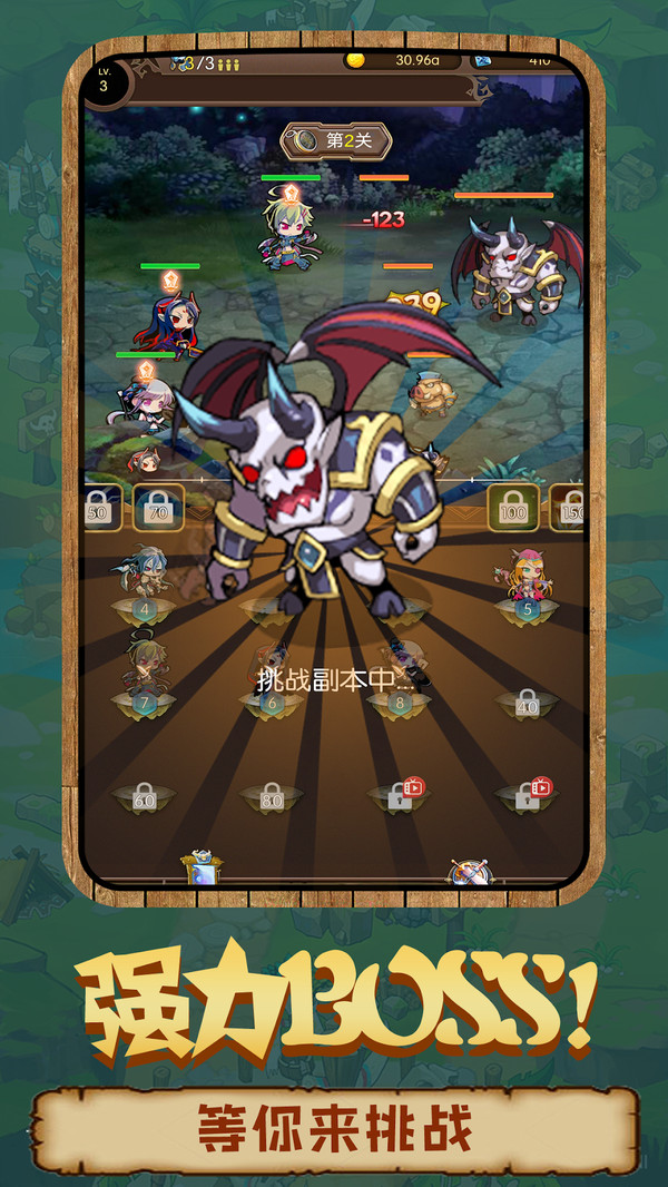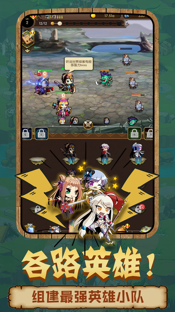 2、轻松休闲的角色养成,派出你的英雄小队,你的英雄将为你自动战斗;每个英雄都有独特的成长路线和技能树,你可以通过装备强化、技能升级等方式打造个性化的战斗团队。