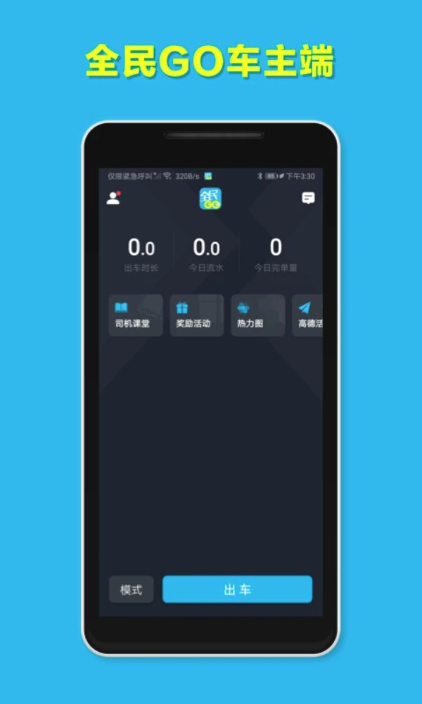 3.登录后点击首页下方的「出车」按钮,开始进入接单模式,准备接收派单任务。系统会实时显示接单状态,并可随时切换为暂停接单模式。