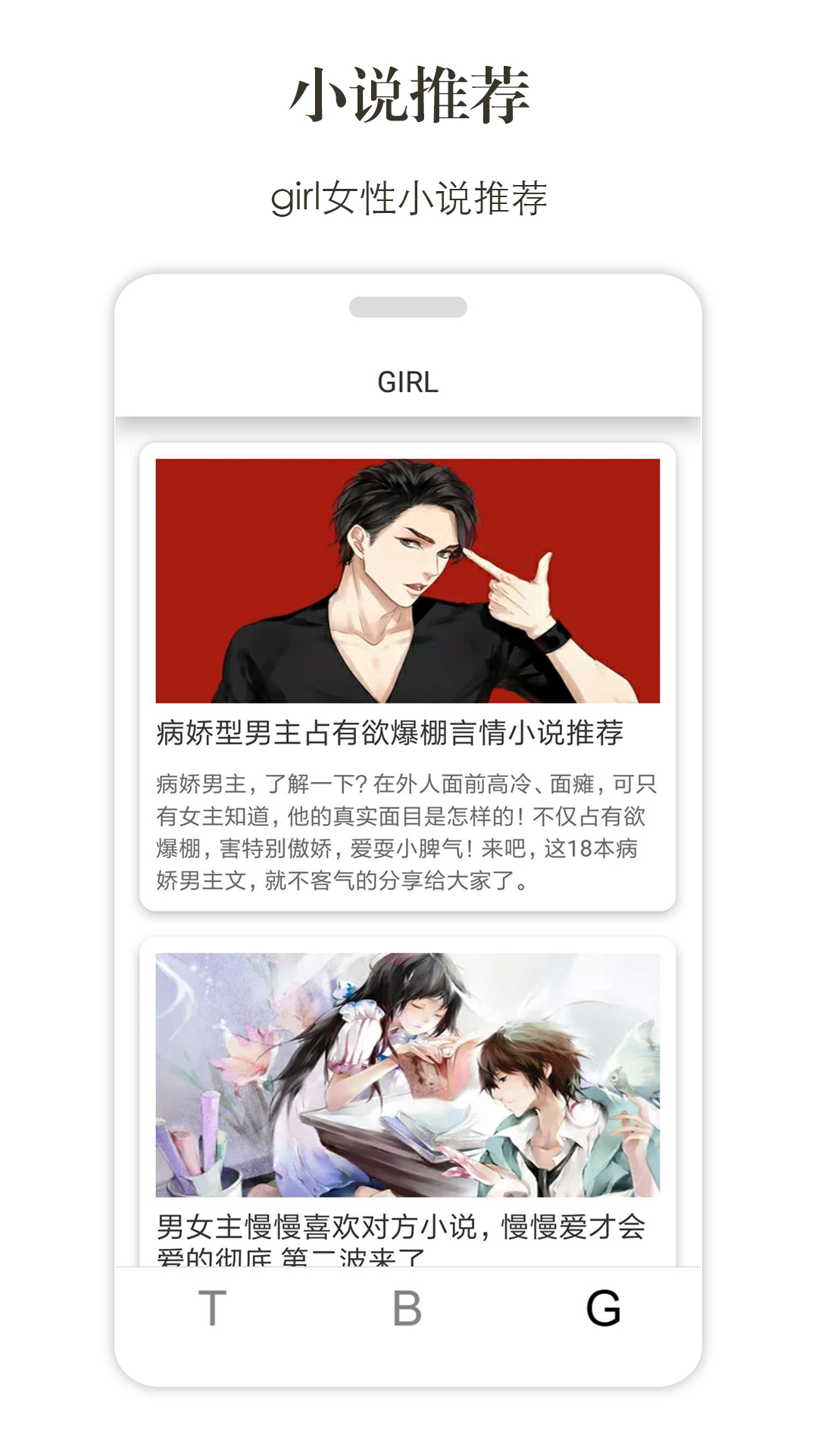 【G】girl女生专属推荐模块专注于女性向小说内容。无论是甜蜜浪漫的现代言情,还是荡气回肠的古代爱情,亦或是扣人心弦的悬疑灵异,我们都能为你找到最适合的阅读选择。特别设置的耽美专区更是满足了特定读者的需求。