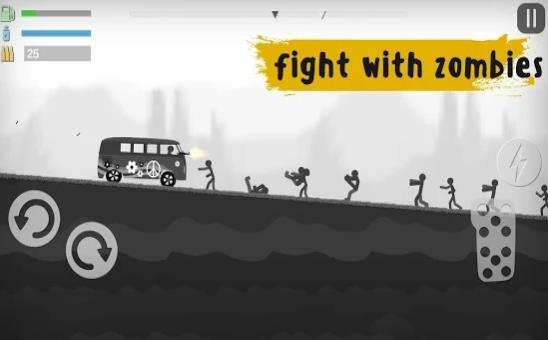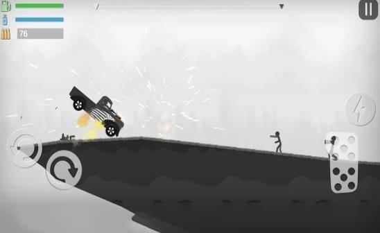 1、横版设计非常简单,灵活使用油门、刹车和左右方向来移动。游戏采用经典的横版视角,操作直观易上手。你可以通过简单的操作完成漂移、急刹等动作,在狭窄的街道中灵活穿梭,同时碾压成群的火柴人僵尸。