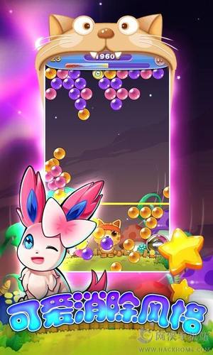 1、动漫风格的泡泡射击游戏,操作简单直观,只需滑动屏幕瞄准发射;