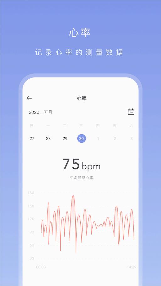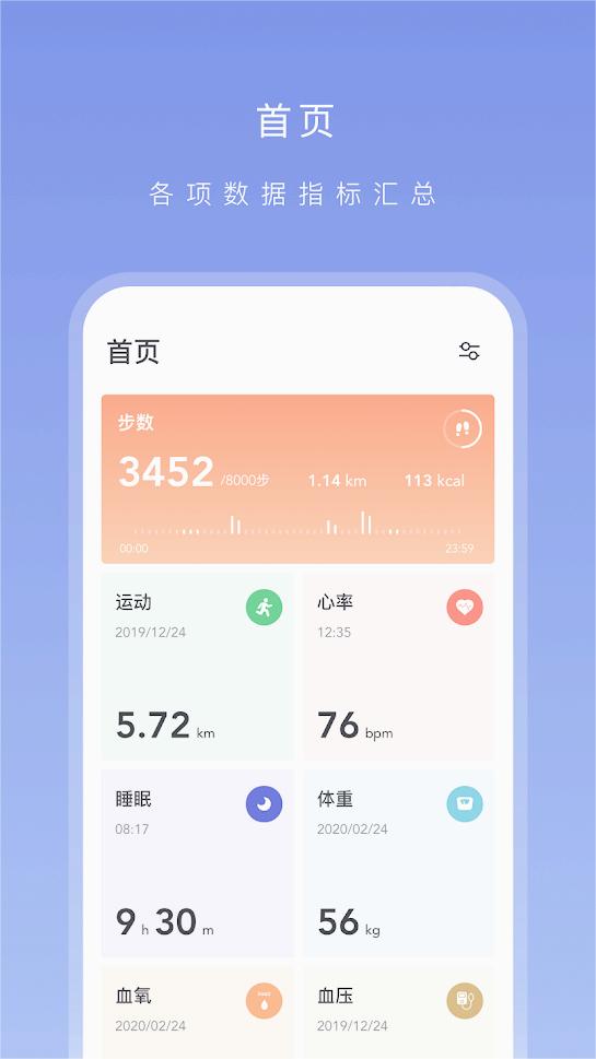 1.同步并展示手表上的运动数据,包括步数、距离、运动时长等,支持历史数据查询与对比分析。