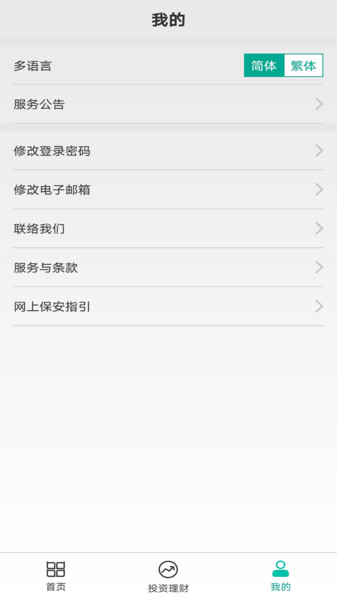 5、语言选择,用户可以自行选择要使用的语言,享受优质服务;系统支持简繁体中文和英文三种语言界面,可根据手机系统语言自动切换。