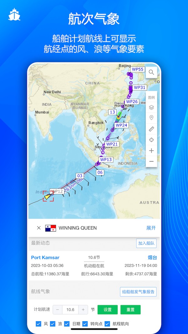 气象水文:集成多源气象预报数据,提供风速、浪高、海流等关键参数的动态展示。支持区域选择和时间轴查看,帮助用户预判航行环境变化。