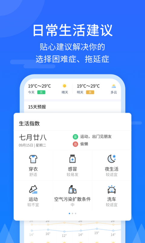 4、全面的天气指数:除了基本的温度、湿度、风向风速等信息外,应用还提供多达20余种专业气象指数,包括紫外线指数、穿衣指数、洗车指数、运动指数等,全方位指导用户的日常生活。15日天气预报功能让用户能够提前规划重要活动,分钟级降水预报则能精确到未来两小时内的降雨情况。