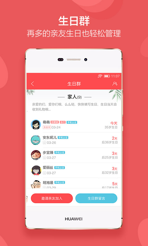 专属生日群组:可按家庭、同学、同事等分组管理,支持群组祝福和礼物众筹功能