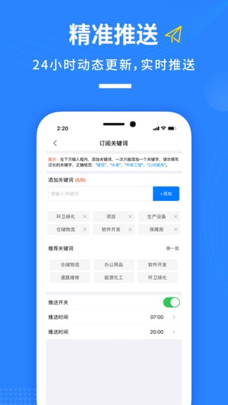 招标推送:根据用户设置的订阅条件,第一时间推送匹配的招标信息。支持按地区、行业、金额等多维度筛选,并可设置推送频率和方式。