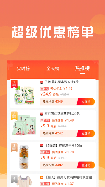 2、超级优惠榜单,各种优惠都可以去领取,给予用户更多购物的轻松。每周更新的TOP100热销榜单和降价排行榜,帮助用户快速锁定最值得购买的商品;