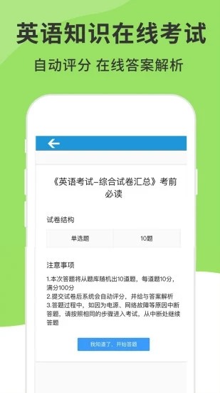 2.英语知识在线考试功能,可随时检测学习成果,了解自身薄弱环节