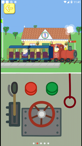 7、点一下乘客来进入火车,点一下火车门关门,点一下绿色按钮开启火车,顺时针转动转盘让火车加速,转动转盘让火车减速。操作方式模拟真实场景,通过简单手势完成复杂动作,培养孩子的手眼协调能力。