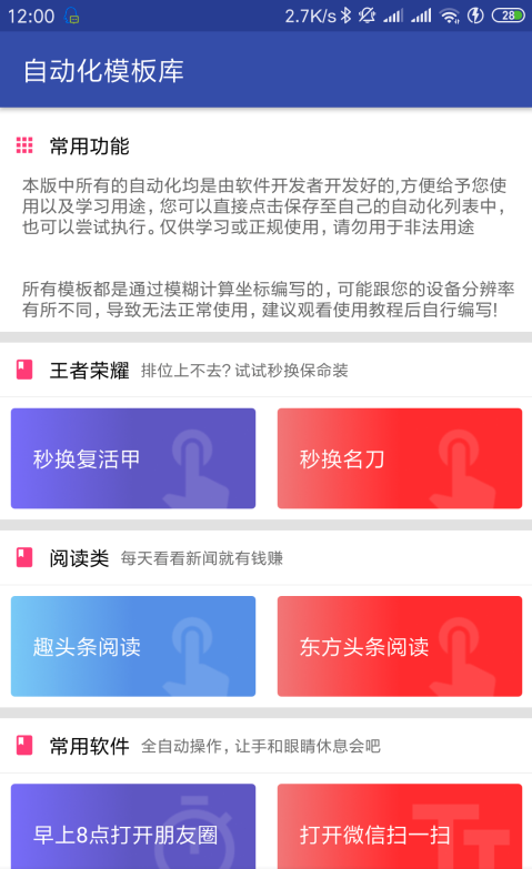 ·目前已经支持多种热门场景,包括王者荣耀秒换装备、定时发布朋友圈、趣头条自动阅读等实用功能,满足不同用户的需求。