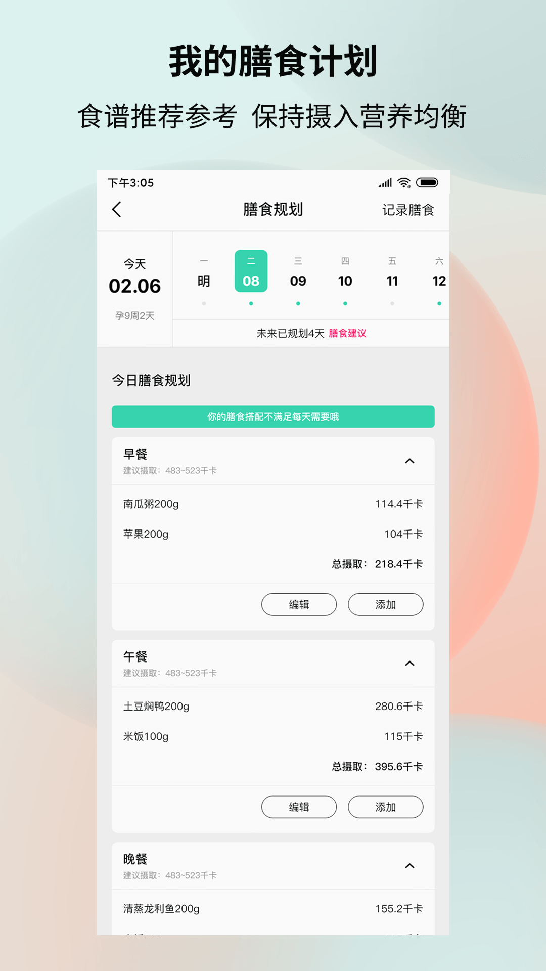 我的膳食计划功能根据孕期营养需求,提供个性化的饮食建议和食谱推荐。系统会考虑孕妈的口味偏好、过敏原等因素,确保营养均衡摄入,满足胎儿各发育阶段的特殊需求。