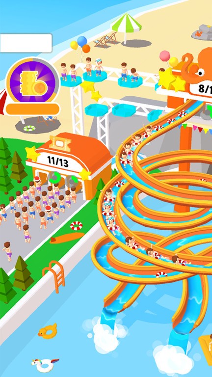 1.游戏采用渐进式难度设计,初期可以从小型滑梯开始建设,逐步解锁更多复杂有趣的水上设施组合,创造独特的游客体验。