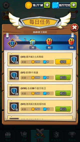 1、游戏采用经典的关卡推进模式,每个关卡都设有独特的敌军配置和地形特点,需要玩家根据实际情况合理调配兵种组合,才能以最小代价取得完美胜利。2、创新性地融入了休闲策略匹配和合成元素,玩家可以通过收集材料合成强力装备,这种多元化的玩法大大拓展了游戏的可玩性。3、任务系统是获取战争资源的核心途径,完成日常任务、主线任务和限时活动都能获得丰厚奖励,这些资源对招募强力军队至关重要。