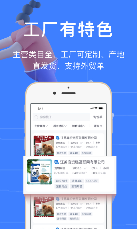 - 工厂频道提供强大的筛选系统,可按行业、规模、地域等维度精准查找目标工厂。每家工厂都设有专属页面,展示详细的企业资质、生产环境、产品线和客户评价等信息,支持在线询价和即时沟通功能,方便用户全面了解工厂实力。