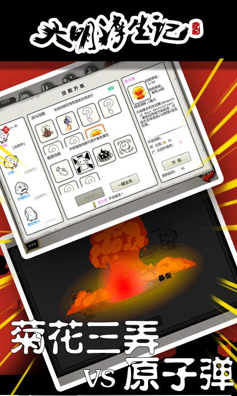 吐口水、菊花三弄、厚脸皮、原子弹、天马流星拳……意想不到技能和效果,只有想不到,没有做不到。游戏中的技能系统完全打破了常规RPG的框架,你可以用"装死"技能逃避战斗,用"拍马屁"技能提升好感度,甚至能用"放屁"技能造成范围伤害。每个技能都有独特的动画效果和实用价值,比如"天马流星拳"可能真的会召唤流星雨,而"原子弹"可能只是个会爆炸的臭鸡蛋。技能之间还能产生意想不到的组合效果,让战斗充满变数和乐趣。