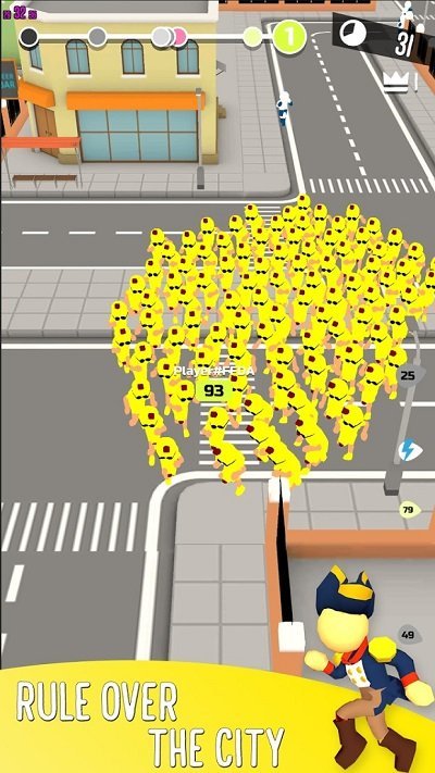 1、玩家需要操控角色在城市街道间灵活穿梭,通过接触路人不断壮大队伍规模,同时要避开各类障碍物和敌对人群;
