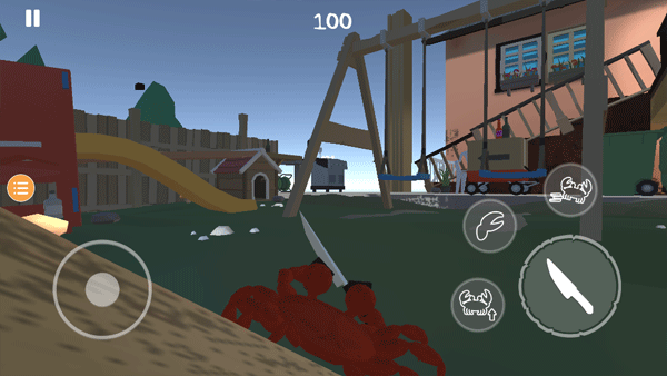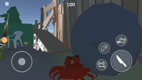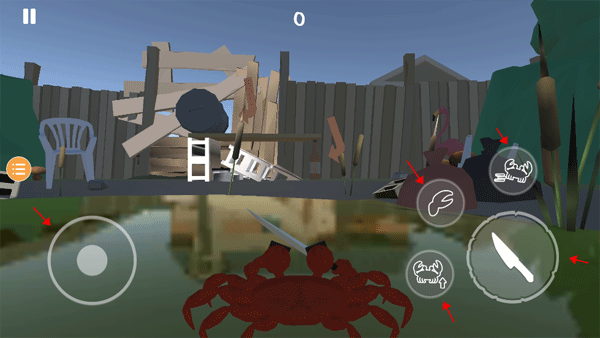 玩家将作为一只螃蟹来进行移动,一开始螃蟹在一个小池塘里面,通过左边的方向键进行移动,如果想跳跃,可以点击右边的向上的箭头,小刀是用来攻击对方的。