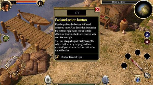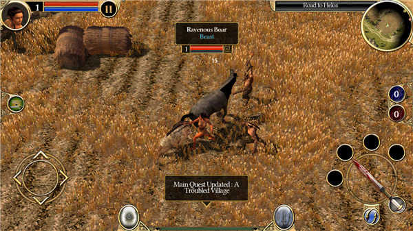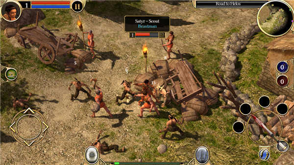 玩家可以首先熟悉下操作,需要注意的是本作中不能旋转视角,只能拉近,可能有个别玩家会觉得不是很适应。玩家一开始出现在一个小型码头旁边,行前两步会有一个头上有黄色菱形箭头的村民,以后玩家看到这种人物的时候就可以和他们对话,可以取得新任务和发展剧情。村民会告诉玩家海勒斯村就在前面不远的地方,并希望玩家可以沿途帮助路上有需要的人,于是玩家带着手上简陋的武器上路了。走了不远就在路边出现一个焦急的村民,他的马正在被萨提和野兽袭击,希望玩家能保护他的马。小菜一碟,玩家二话不说就帮这个村民消灭了农田里的野兽。
