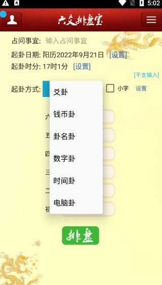 首先我们进入app的主页,在主页中填写自己的占问事宜、起卦日期以及起卦时分,之后我们就要选择起卦方式了,如果你是专业人士的话其他的起卦方式你应该懂,小编就用电脑卦来做示范吧。我现在我们选择交互起卦还是直接起卦。