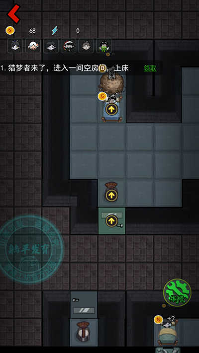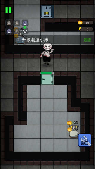 在倒计时5秒的时候升级床,然后升2级门,如果鬼先攻击我们,我们就建立武器,然后升级门,门快击破时可以点修复键