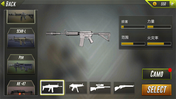 玩家需要根据需求来选择枪械点击SELECT进入游戏游玩;