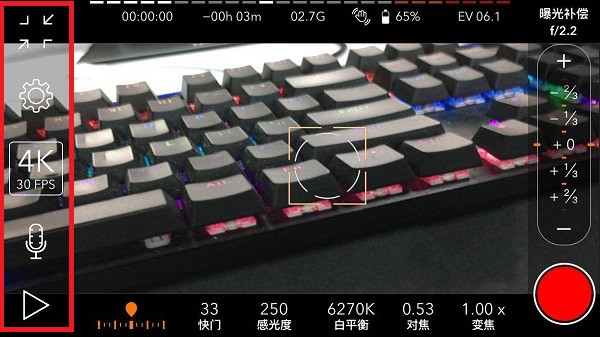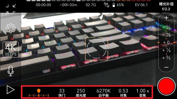 在下面一栏中,可以更改快门、感光、白平衡、对焦、变焦等参数。