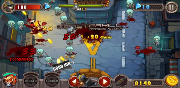 横扫僵尸开始时的绿头小僵尸是很脆的,一枪爆头,拿起你的武器将它们打成肉酱吧,游戏得高分的一个关键就是你的连续击杀combo数了,不到危急时刻,就用你的机枪一直扫吧,爆炸效果最后再用游戏越到后面僵尸就越难打了,这就需要你切换武器了