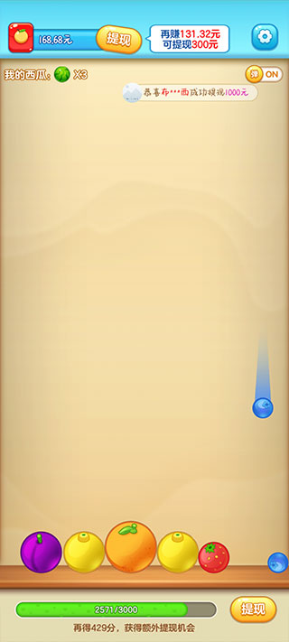 每次合成水果后都会获得一定的积分,累计满积分条就可以进行随机抽奖,并获得更多的提现金额。