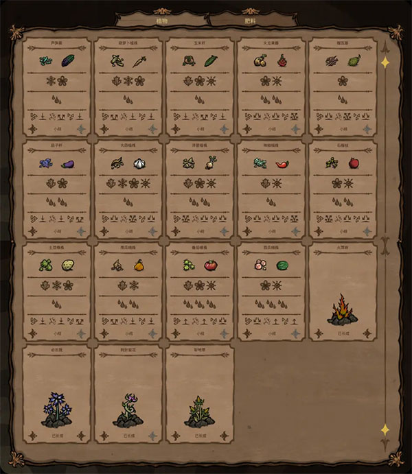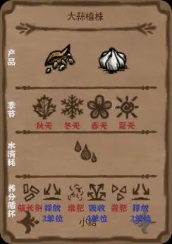 每个农作物的产品下面有三栏介绍,其中第一栏为适宜生长的季节,第二栏为水消耗,第三栏为养分循环。在养分循环中,每种农作物生长过程中都会涉及到三种养分,从左到右依次为:催长剂、堆肥、粪肥,每种养分后面有箭头,箭头向下表示向土地释放,向上表示从土地中吸收,并且1个箭头表示每个生长阶段结算时吸收或释放1个单位,2个箭头表示吸收或释放2个单位,以此类推。