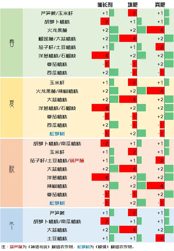 不妨规定向耕地释放养分为+,从耕地吸收为-,并且将养分情况完全一致的农作物看作是“等效农作物”,并将等效农作物合并为一种农作物看待,因为等效农作物在种植时可以相互替代。例如春天,芦笋蕨和玉米杆都是释放1单位催长剂,吸收2单位堆肥,释放1单位粪肥,所以就互为等效农作物。将农作物的养分数据按季节整理如下: