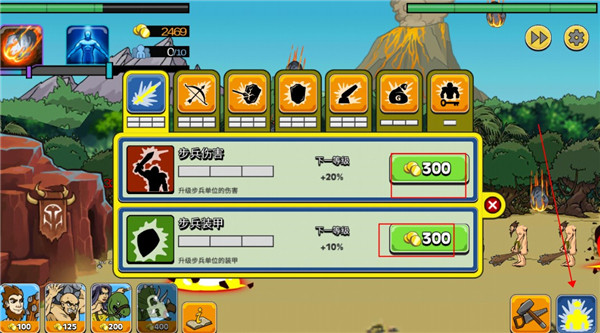除此之外,点击右下角此处,还可以花费金币,升级士兵们的各项属性,以便能够更高的击溃敌方