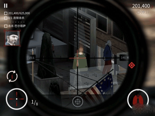 之后上面会有个警卫也透过玻璃去看那辆车。打玻璃打警卫为就会砸中另一个人,就可以完成连锁击杀。