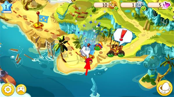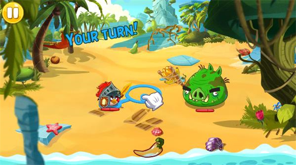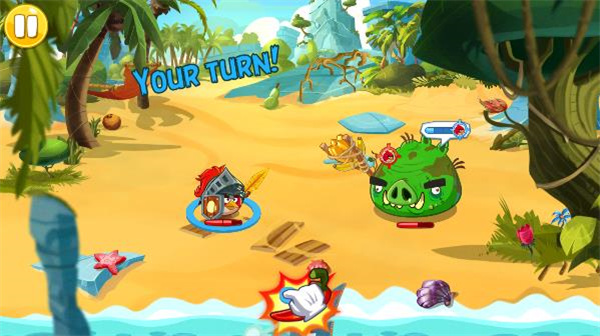 小鸟们乘坐鸟船来到了石灰石泻湖,这一关总共有三轮敌人。第一轮对面只有一个海盗,完全是给我们来练手的,两个攻击回合就可轻松解决它。第二轮对面敌人的数量开始增多,第一回合先用小鸟们的自身防御技能,接下来的回合先杀死全部小兵再解决戴头巾的BOSS。