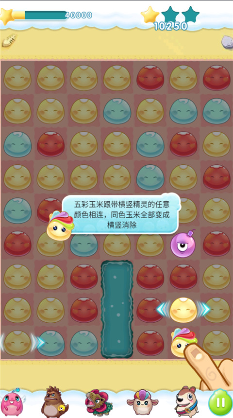 五彩玉米跟带横竖精灵的任意颜色相连,同色玉米全部变成横竖消除;
